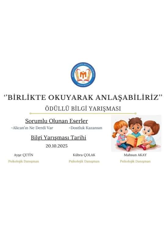 Okul rehberlik ve psikolojik danışma servisimiz tarafından yürütülen “Birlikte Okuyarak Anlaşabiliriz” Ödüllü Bilgi Yarışması, 20.10.2025 tarihinde yüz yüze ve Türkçe dilinde düzenlenecektir. Bu yarışma, öğrencilerin akran zorbalığı konusunda farkındalık kazanmasını ve bu konuya duyarlı bireyler olmalarını teşvik etmeyi amaçlar. Yarışma kapsamında, "Alican’ın Ne Derdi Var" ve "Dostluk Kazansın" adlı eserlerden sorumlu olunacaktır. Yarışmacıların sıralaması, bu eserlerden hazırlanmış çoktan seçmeli sorularla belirlenecektir. Bu yarışmanın amacı, ilkokul 3. ve 4. sınıf öğrencilerinin akran zorbalığı konusunda bilinçlenmelerini sağlamak, zorbalığın türlerini ve etkilerini anlamalarına yardımcı olmak ve zorbalıkla nasıl mücadele edileceği konusunda onlara yol göstermektir. Aynı zamanda, kitap okuma alışkanlığını pekiştirmek ve öğrencilere empati, dostluk ve dayanışma gibi değerleri aşılamaktır.